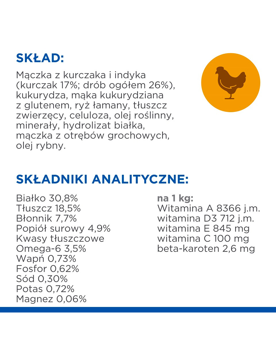 mączka z kurczaka i indyka (kurczak 17%, drób ogółem 26%), kukurydza, kukurydziana mączka glutenowa, ryż łamany, tłuszcz zwierzęcy, pulpa, olej roślinny, minerały, hydrolizat białka, mączka z otrębów grochu, olej rybny.