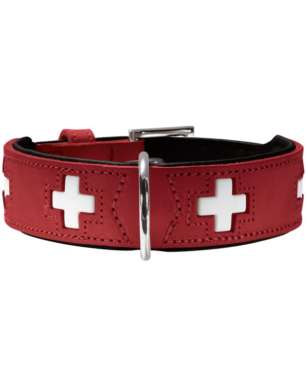 Obroża Swiss została wykonana z dwóch rodzajów organicznej skóry: zewnętrzna część ze skóry bydlęcej, a wewnętrzna z cielęcej, dzięki czemu część przylegająca do szyi psa jest miękka, delikatna i nie wywołuje podrażnień. Obroża zapewnia komfort podczas spacerów i nie wyciera sierści. W środek wszyty jest dodatkowy pasek do którego przymocowany jest ozdobny wzór. Wierzchnia warstwa została dodatkowo obszyta wokół krzyży, co zapewnia ich stabilne mocowanie.