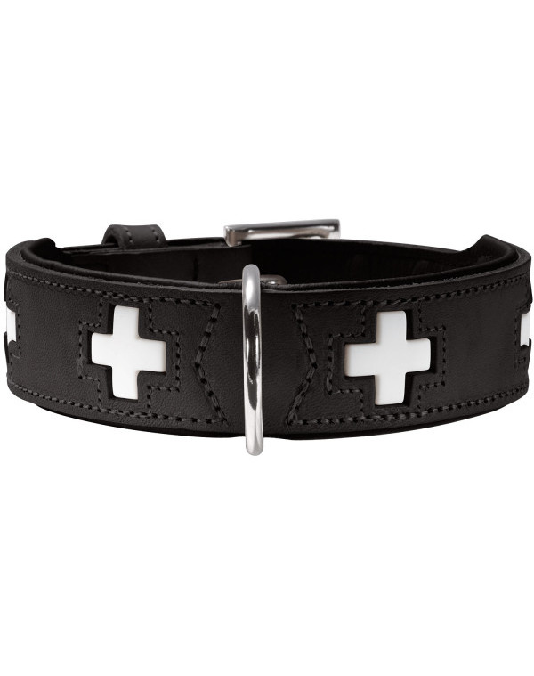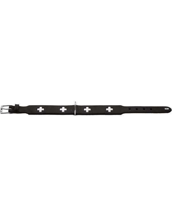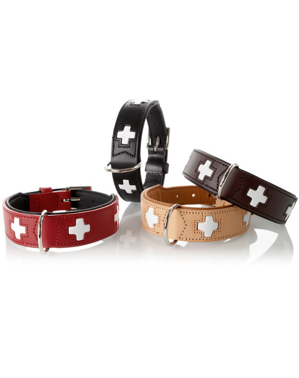 Obroża Swiss została wykonana z dwóch rodzajów organicznej skóry: zewnętrzna część ze skóry bydlęcej, a wewnętrzna z cielęcej, dzięki czemu część przylegająca do szyi psa jest miękka, delikatna i nie wywołuje podrażnień. Obroża zapewnia komfort podczas spacerów i nie wyciera sierści. W środek wszyty jest dodatkowy pasek do którego przymocowany jest ozdobny wzór. Wierzchnia warstwa została dodatkowo obszyta wokół krzyży, co zapewnia ich stabilne mocowanie.