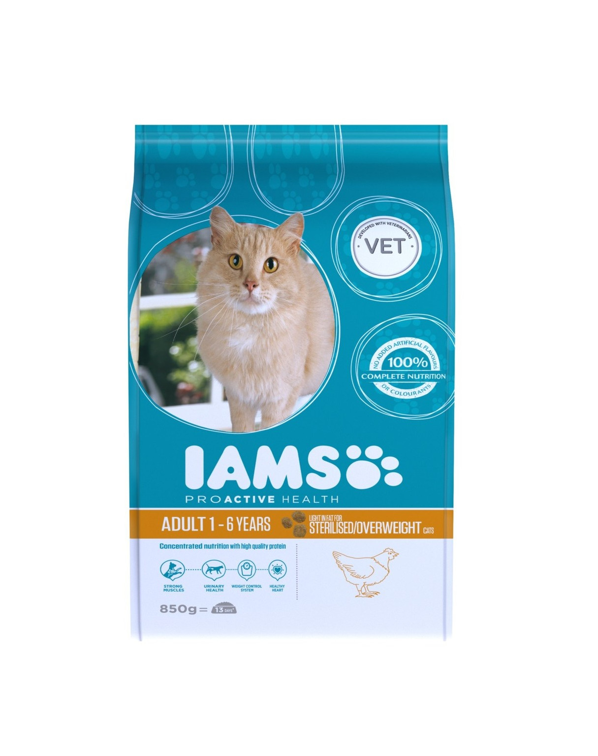 IAMS ProActive Health Adult Light in Fat for Sterilised/Overweight kurczak (kurczak i indyk 30%) to w 100% kompletna i zbilansowana karma dla kotów dorosłych ze skłonnością do nadwagi. Idealna dla kotów z nadwagą - dostarcza 30% mniej tłuszczu niż inne karmy IAMS dla kotów dorosłych.