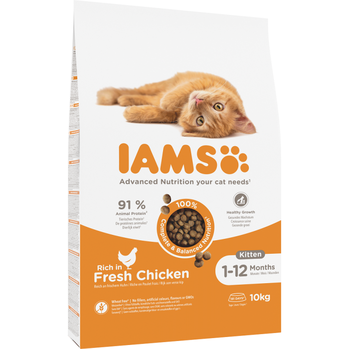 IAMS for Vitality dla kociąt ze świeżym kurczakiem to w 100% pełnoporcjowa i zbilansowana karma. Nowa, smakowita i ulepszona receptura zawiera aż 91% białka pochodzenia zwierzęcego (z całkowitej zawartości białka) i wszystkie składniki niezbędne rosnącemu i rozwijającemu się kocięciu. Pyszna karma nie zawiera żadnych zbędnych dodatków, sztucznych barwników czy aromatów, ani GMO. Co więcej, nowa receptura pozbawiona jest pszenicy*.