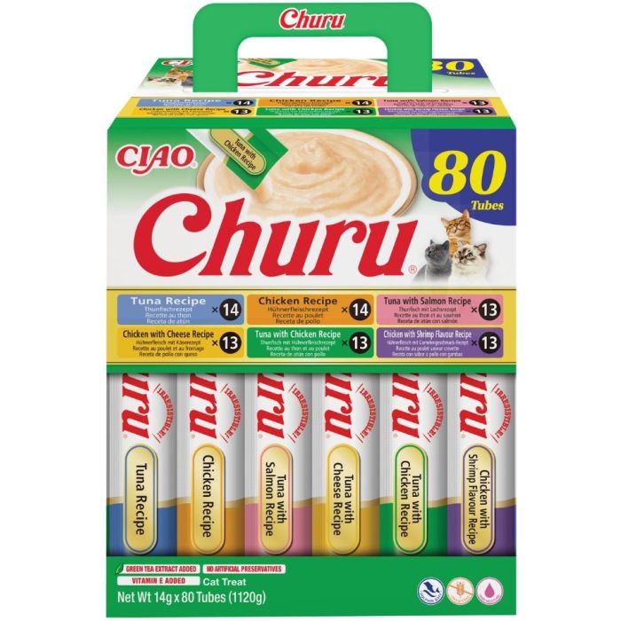 W opakowaniu znajduje się 80 tubek Churu, w sześciu smakach: