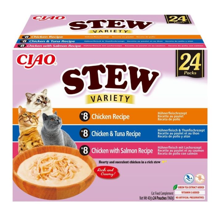 INABA Ciao Stew Variety w dużym opakowaniu 24×40 g to ekonomiczny zestaw lekkiej, półpłynnej karmy uzupełniającej, stworzonej na bazie soczystego stew z kurczakiem, tuńczykiem i łososiem. Gęstsza konsystencja niż w bulionie oraz wyrazisty aromat sprawiają, że produkt jest wyjątkowo atrakcyjny nawet dla bardzo wybrednych kotów.
