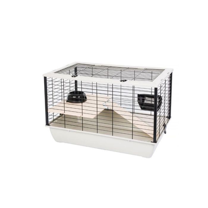 Wyposażona klatka dla gryzoni i królików miniaturek. Klatka posiada głęboką kuwetę, co zapobiega wysypywaniu się trocin poza klatkę, a jednocześnie umożliwia drążenie tuneli i zakopywanie się w podłożu. W klatce znajduje się paśnik na siano, miseczka plastikowa, a także rozszerzenie powierzchni klatki, czyli plastikowa półeczka oraz drewniana drabinka do wspinania się.
