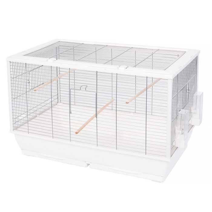 Klatka z żerdziami dla ptaków. Klatka posiada głęboką kuwetę i dwie szuflady, dzięki czemu jest łatwa w czyszczeniu i myciu. Otwierana jest od góry, co ułatwia dostęp do ptaków, a zapięcia na zatrzaski zapewniają maksimum bezpieczeństwa. Dodatkowo na froncie i z boku znajdują się drzwiczki.