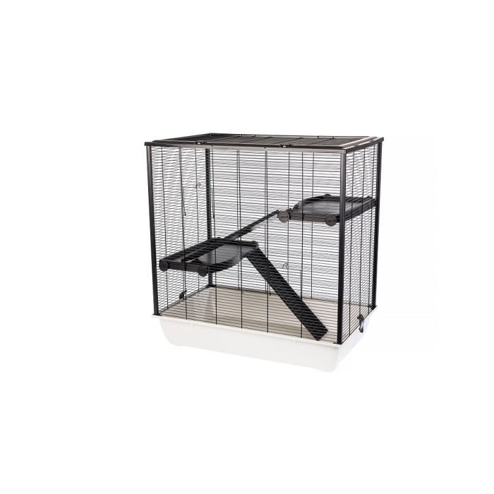 Posiada dwa pięterka, do których prowadzą drabinki. Wyposażenie i kuweta klatki są plastikowe, dzięki czemu bardzo łatwo utrzymać je w czystości, nie stanowią również niebezpieczeństwa zahaczenia się zwierzęcia. Sama kuweta jest głęboka, co zapobiega wysypywaniu się trocin poza klatkę.