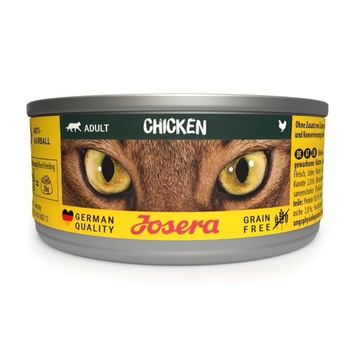 Mmm, czas na pyszne urozmaicenie! Nasz nowy asortyment karm mokrych w puszkach dla kotów to jeszcze większy wybór i jeszcze więcej smaków w miseczce. Twój pupil będzie zachwycony pysznym daniem Josera Chicken z delikatnym kurczakiem. Bezzbożowa receptura została wzbogacona o olej z łososia, który dostarcza niezbędne kwasy tłuszczowe omega-3 i wzmacnia walory smakowe.