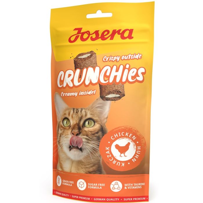 Wow, ale chrupiące! Przekąski Josera Crunchies Chicken oferują o wiele więcej -ponieważ wypełnione są kremowym nadzieniem z pysznym kurczakiem dla głodnych kociaków! Te bezzbożowe i niskokaloryczne przysmaki to idealna przekąska na każdy dzień.