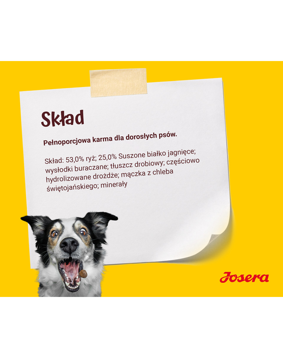 ryż 53%, suszone białko jagnięce 25%, wysłodki buraczane, tłuszcz drobiowy, częściowo hydrolizowane drożdże, mączka z chleba świętojańskiego, minerały.