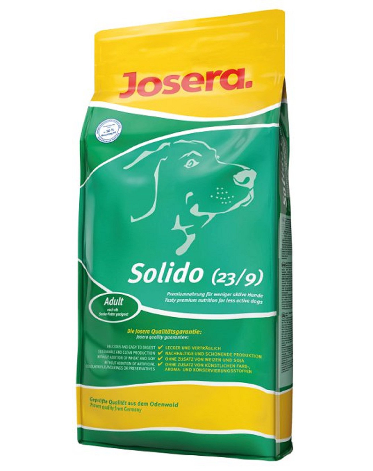 Josera Solido jest lekką, jednorodną karmą z mięsem i najlepszym pełnym ziarnem dla mało aktywnych, dorosłych psów.