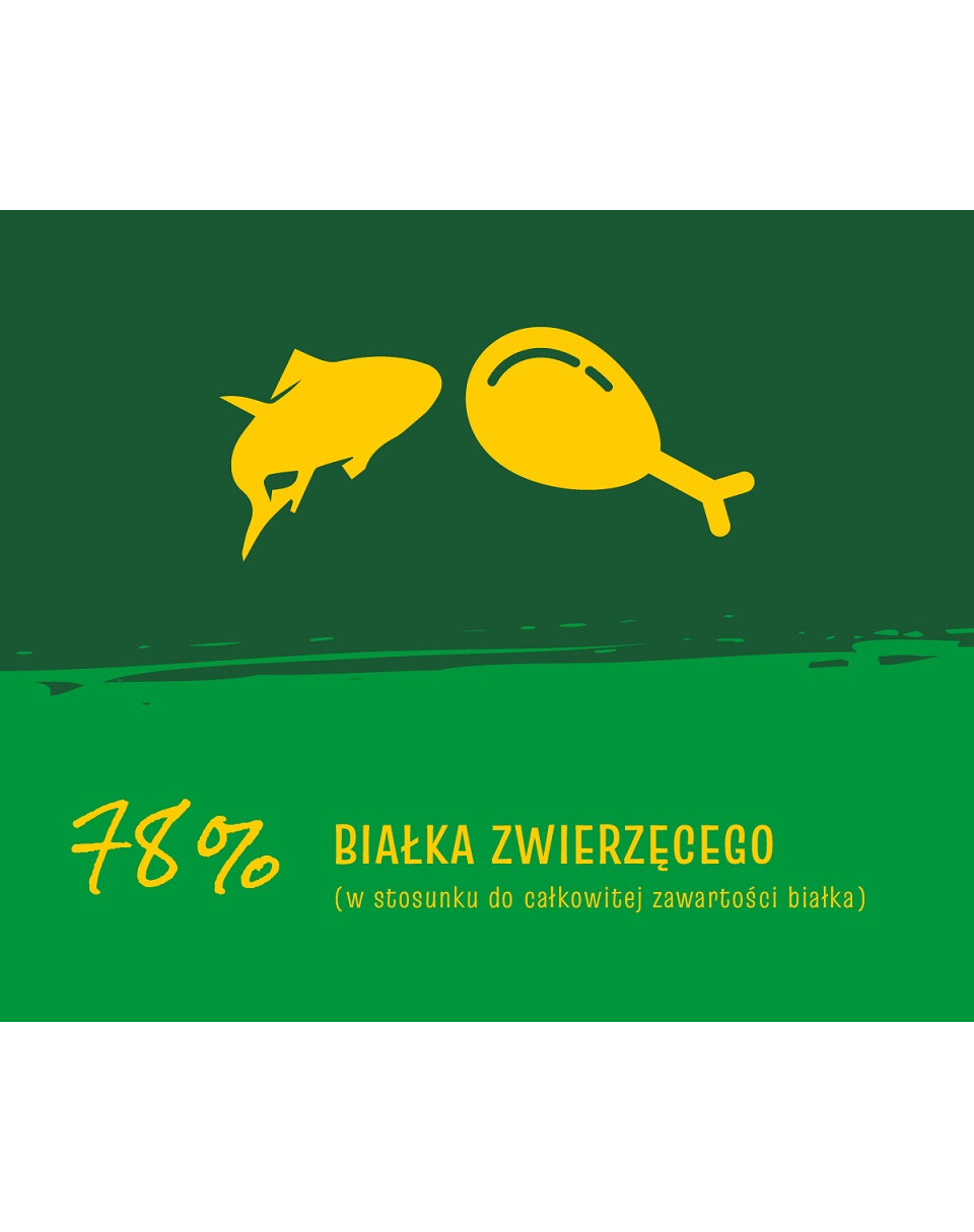 Skład: zboża; mięso oraz produkty pochodzenia zwierzęcego (suszone białko drobiowe 25,0%); produkty pochodzenia roślinnego; oleje i tłuszcze; ryby i produkty pochodne z ryb; minerały.
