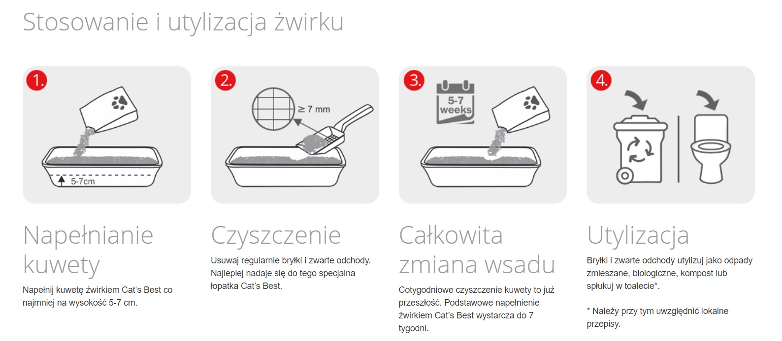 Żwirek Cats Best Eco Plus jest jedynym żwirkiem, który ulega biodegradacji, można go po prostu wysypać do kosza z odpadami biologicznymi lub usunąć w toalecie ( jednorazowo w małych ilościach). Wszystkie produkty tego producenta powstają w oparciu o koncepcję produktu naturalnego i zrównoważonego ekologicznie. Do produkcji żiwrku stosowane są wyłącznie włókna roślinne z wyselekcjonowanych gatunków drewna z lokalnych, zrównoważonych upraw leśnych.
