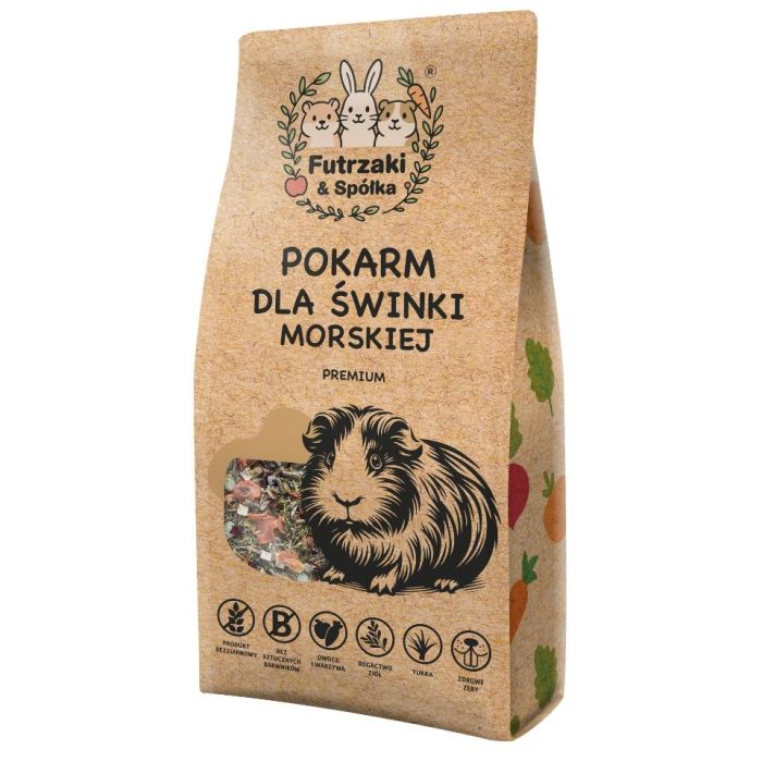 Futrzaki & Spółka – Pokarm dla Świnki Morskiej PREMIUM to pełnowartościowa, bezzbożowa karma stworzona z myślą o codziennych potrzebach żywieniowych świnek morskich. Naturalna receptura oparta na lucernie, trawie, ziołach, owocach i warzywach dostarcza cennych witamin oraz minerałów, które wspierają zdrowie i dobre samopoczucie pupila.