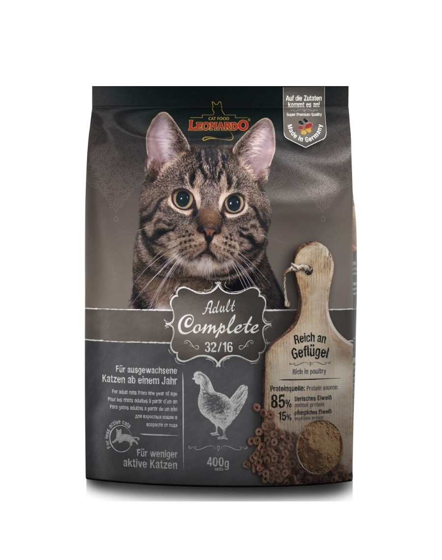 Karma Leonardo Adult Complete 32/16 to sucha karma posiadająca zmniejszoną zawartość energii dla zachowania odpowiedniej sylwetki kota o niskim poziomie aktywności fizycznej. Zawiera 16% tłuszczu, białko zwierzęce na poziomie 32% oraz zbilansowaną kompozycję substancji witalnych. Siemie lniane dostarcza do organizmu kota tłuszcze omega-3, które wraz z lecytyną wspierają zachowanie zdrowej skóry i lśniącej sierści. Karma posiada lekko wędzony smak i naturalny słodowy aromat, które są uwielbiane przez koty.