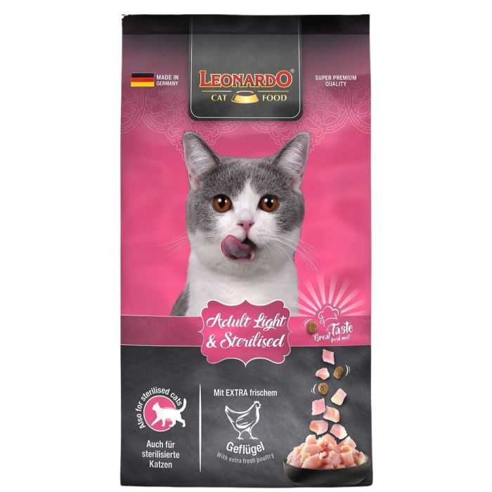 Karma Leonardo Adult Light to sucha karma posiadająca zmniejszoną zawartość energii dla zachowania odpowiedniej sylwetki kota z nadwagą i o niskim poziomie aktywności fizycznej. Wczesne wprowadzenie diety poprzez zastosowanie karmy o obniżonej wartości energetycznej może w istotny sposób poprawić komfort życia kota i zapewnić zdrowie na dłużej. Karma zawiera dodatkową porcję świeżego drobiu zapewniającego białko pochodzenia zwierzęcego.