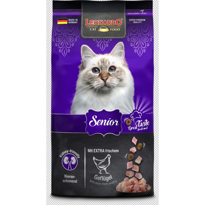 Leonardo Senior to niskoenergetyczna karma stworzona z myślą o utrzymaniu prawidłowej masy ciała starszych kotów. Ma niską zawartość fosforu, sodu i białka, jest łagodny dla nerek. Jest to naturalny suplement przeciwstarzeniowy, który utrzymuje zdrowie i witalność układu sercowo-naczyniowego. Błonnik zawarty w nasionach chia zmniejsza ryzyko zaparć i poprawia motorykę jelit.