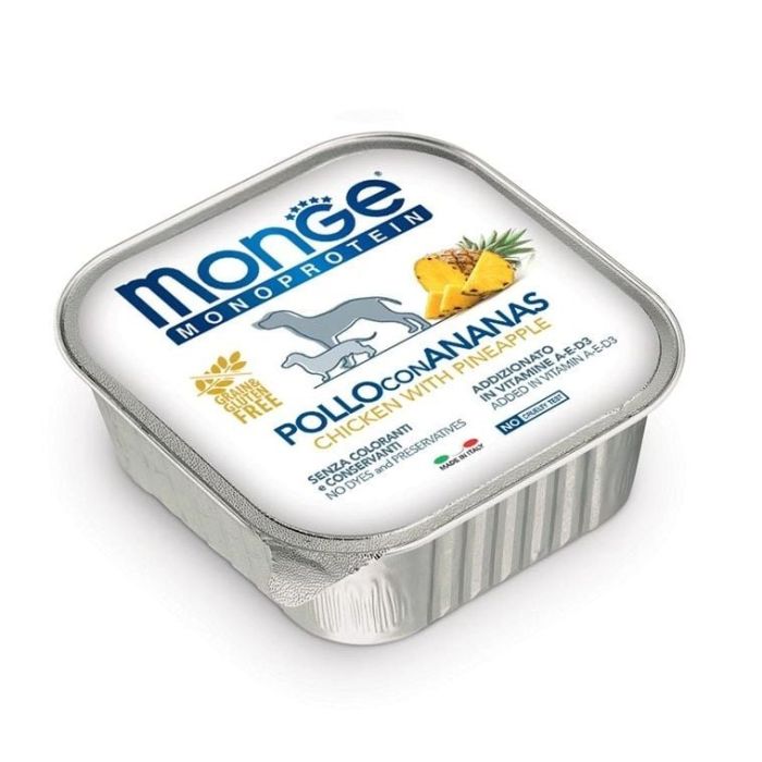 Monge MONOPROTEIN to pasztet z linii karm jednobiałkowych z wyselekcjonowanego mięsa kurczaka najwyższej jakości z dodatkiem ananasa. W 100% włoska receptura bogata w witaminy A, E, D3 z gwarancją źródła białka tylko z jednego rodzaju mięsa. Bez sztucznych barwników i konserwantów. Niskosłodzona receptura. Idealna dla alergików.
