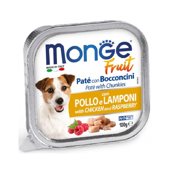 Monge Fruit Pasztet dla dorosłego psa z kurczakiem i malinami z wyczuwalnymi kawałkami, stworzony według oryginalnej włoskiej receptury. Niezwykle odżywczy, z dodatkiem kurczaka i malin, bez barwników, konserwantów i tłuszczów typu trans.
