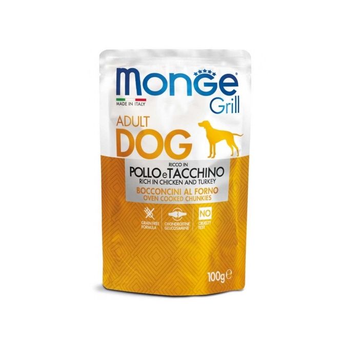 Kompletna mokra karma dla psów, stworzona na bazie perfekcyjnie grillowanego mięsa kurczaka z dodatkiem indyka. Zawiera chondroitynę i glukozaminę potrzebne dla prawidłowego rozwoju stawów. Dzięki produktom Monge Grill twój pies będzie się mógł pochwalić piękną, lśniącą sierścią. Jest to produkt bezzbożowy.