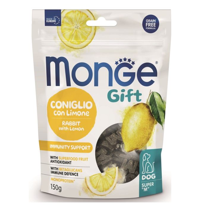 Monge Gift Super M Immunity Support Dog Adult Królik z cytryną to pyszna przekąska z mocą superfood w formie mięsnych, wilgotnych krokietów w kształcie litery M.