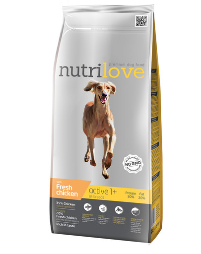 Nutrilove Active – (świeży kurczak 20%, suszony drób (15% kurczaka), drób ogółem 40%) jest wysokiej jakości karmą dla psów o wzmożonej aktywności fizycznej, odpowiednią także dla ciężarnych lub karmiących suk. Wysoka zawartość białka i tłuszczu pokrywa zwiększone zapotrzebowanie na energię i składniki budulcowe. Doskonały smak bez dodatku sztucznych aromatów, ze świeżym kurczakiem. Bez dodatku konserwantów i barwników. Wszystko, czego Twój pies potrzebuje.