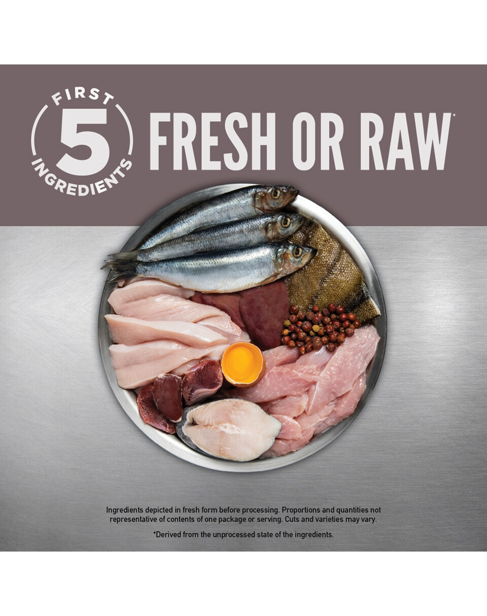 Świeży kurczak (25%), surowy cały śledź (6%), surowy indyk (6%), świeże podroby z kurczaka (wątroba, serce) (6%), surowy cały morszczuk (5%), surowa cała makrela (5%), świeże jaja (5%), odwodniony kurczak (4%), odwodniona makrela (4%), odwodniona sardynka (4%), odwodniony śledź (4%), odwodniony indyk (4%), odwodniona sieja (4%), błonnik z soczewicy, cała fasola pinto, cała fasola navy, cała ciecierzyca, cała czerwona soczewica, cała zielona soczewica, cały groszek, skrobia grochowa, surowa wątróbka z indyka (1. 5%), tłuszcz z kurczaka (1. 5%), błonnik jabłkowy, algi (źródło DHA), suszone wodorosty, świeża dynia w całości, świeża dynia piżmowa w całości, świeża cukinia w całości, świeża marchew w całości, świeże jabłka w całości, świeże gruszki w całości, suszony korzeń cykorii, świeży jarmuż, świeży szpinak, świeże buraki, świeża rzepa, żurawina w całości, borówki w całości, jagody saskatoon w całości, kurkuma, ostropest plamisty, korzeń łopianu, lawenda, prawoślaz lekarski, owoce dzikiej róży.