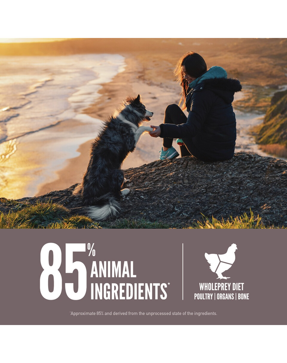 Świeży kurczak (25%), surowy cały śledź (6%), surowy indyk (6%), świeże podroby z kurczaka (wątroba, serce) (6%), surowy cały morszczuk (5%), surowa cała makrela (5%), świeże jaja (5%), odwodniony kurczak (4%), odwodniona makrela (4%), odwodniona sardynka (4%), odwodniony śledź (4%), odwodniony indyk (4%), odwodniona sieja (4%), błonnik z soczewicy, cała fasola pinto, cała fasola navy, cała ciecierzyca, cała czerwona soczewica, cała zielona soczewica, cały groszek, skrobia grochowa, surowa wątróbka z indyka (1. 5%), tłuszcz z kurczaka (1. 5%), błonnik jabłkowy, algi (źródło DHA), suszone wodorosty, świeża dynia w całości, świeża dynia piżmowa w całości, świeża cukinia w całości, świeża marchew w całości, świeże jabłka w całości, świeże gruszki w całości, suszony korzeń cykorii, świeży jarmuż, świeży szpinak, świeże buraki, świeża rzepa, żurawina w całości, borówki w całości, jagody saskatoon w całości, kurkuma, ostropest plamisty, korzeń łopianu, lawenda, prawoślaz lekarski, owoce dzikiej róży.