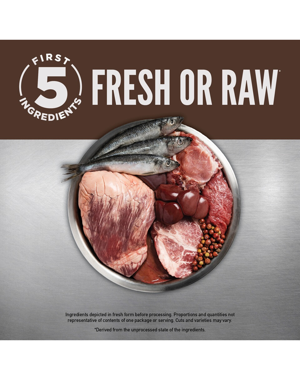 Wołowina surowa (13%), surowa cała sardynka (11%), surowe mięso bizona (5%), surowa jagnięcina (5%), wieprzowina surowa (5%), surowa wątroba wołowa (5%), surowa wątroba wieprzowa (5%), świeże jaja (4%), dehydratyzowana jagnięcina (4%), wołowina dehydratyzowana (4%), dehydratyzowany śledź (4%), dehydratyzowana sardynka (4%), dehydratyzowana baranina (4%), wieprzowina dehydratyzowana (4%), olej rzepakowy, cała czerwona soczewica, cały groch, cała ciecierzyca, cała zielona soczewica, skrobia grochowa, olej z siei (2%), surowa wątroba jagnięca (2%), mintaj suszony (2%), cała fasola pinto, cała fasola zwyczajna, włókno soczewicy, surowe nerki wołowe (0,5%), surowe żołądki wołowe (0,5%), surowe nerki jagnięce (0,5%), surowe flaki jagnięce (0,5%), wodorosty suszone, świeża cała dynia, świeża cała dynia piżmowa, świeża cała cukinia, świeża cała marchew, świeże całe jabłka, świeże całe gruszki, suszony korzeń cykorii, świeży jarmuż, świeży szpinak, świeża botwinka, świeże liście rzepy, cała żurawina, cała borówka amerykańska, całe owoce świdośliwy, kurkuma, ostropest plamisty, korzeń łopianu, lawenda, korzeń prawoślazu lekarskiego, owoce dzikiej róży.