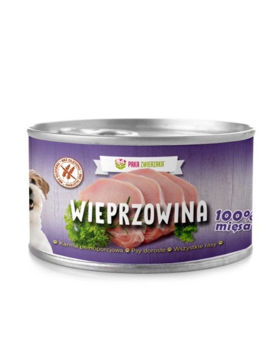 Naturalna karma mokra składająca się w 100% z wieprzowiny.