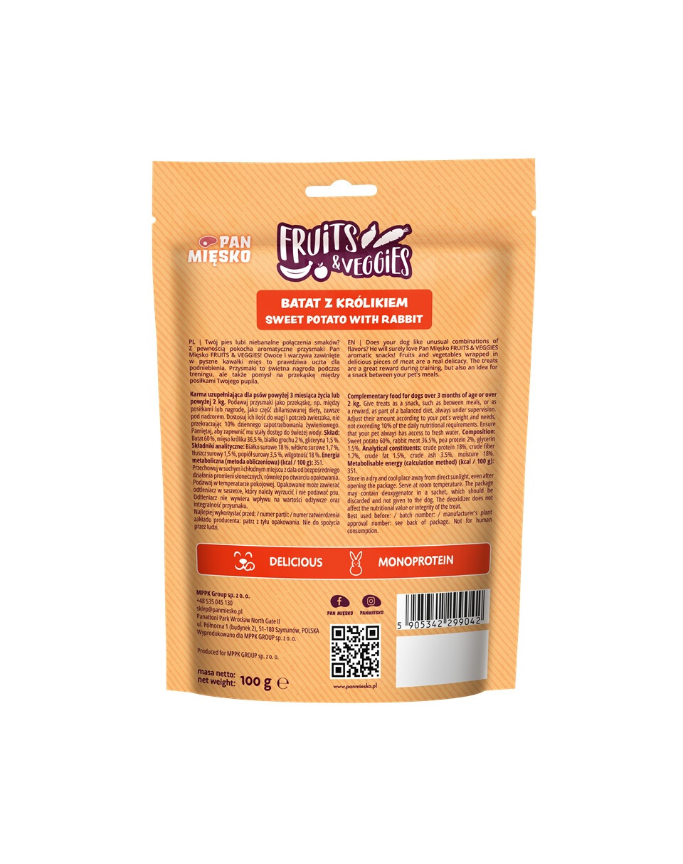 Twój pies lubi niebanalne połączenia smaków? Z pewnością pokocha aromatyczne przysmaki Pan Mięsko FRUITS & VEGGIES! Owoce i warzywa zawinięte w pyszne kawałki mięs to prawdziwa uczta dla podniebienia. Przysmaki to świetna nagroda podczas treningu, ale także pomysł na przekąskę między posiłkami Twojego pupila.
