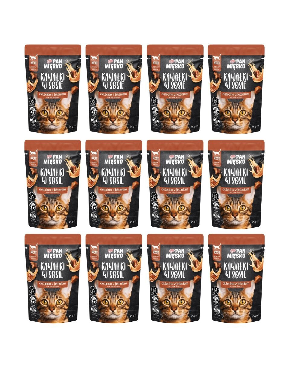 SKŁAD: cielęcina 71 % w rozdrobnionych kawałkach* (mięso 31 %, serca, wątroba, płuca), jeleń 8 % w rozdrobnionych kawałkach*, białko wołowe 3 %, skrobia z tapioki, składniki mineralne, suszona żurawina 0,2 %, olej z łososia 0,2 %, suszone drożdże piwne 0,2 %, bazylia 0,1 %. *Kawałki stanowią 52 % gotowego produktu.