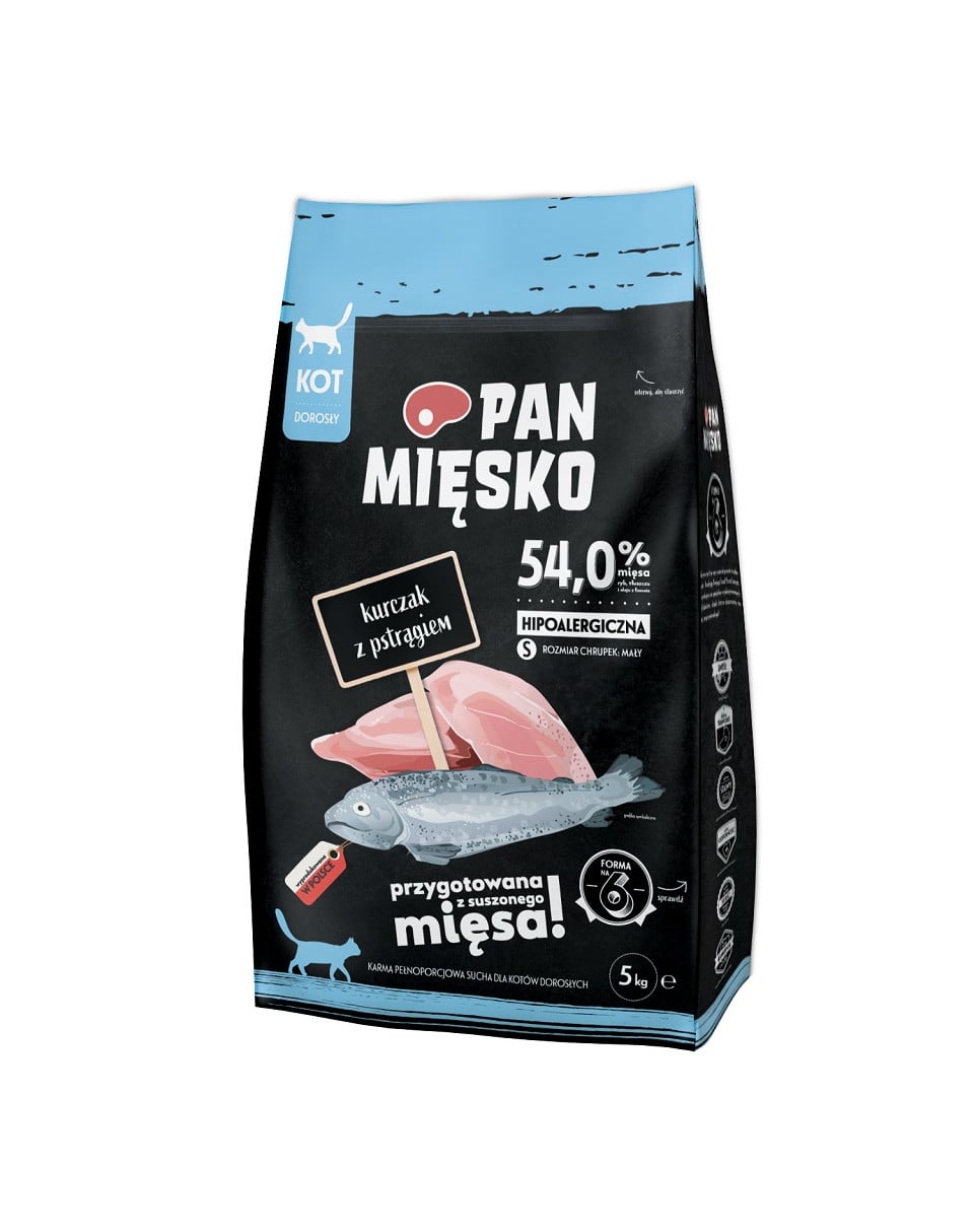 Poznaj hipoalergiczne suche karmy dla kotów Pan Mięsko. Wyróżniają je starannie wyselekcjonowane mięsa z dodatkiem soczystych polskich jabłek, zdrowych warzyw i cennych składników odżywczych, które pozytywnie wpłyną na zdrowie oraz kondycję Twojego kota. Nasze receptury zostały przygotowane przez specjalistów, po to, aby dostarczyć Twojemu czworonożnemu towarzyszowi dokładnie to, czego potrzebuje. Twój kot zasługuje na wszystko, co najlepsze.