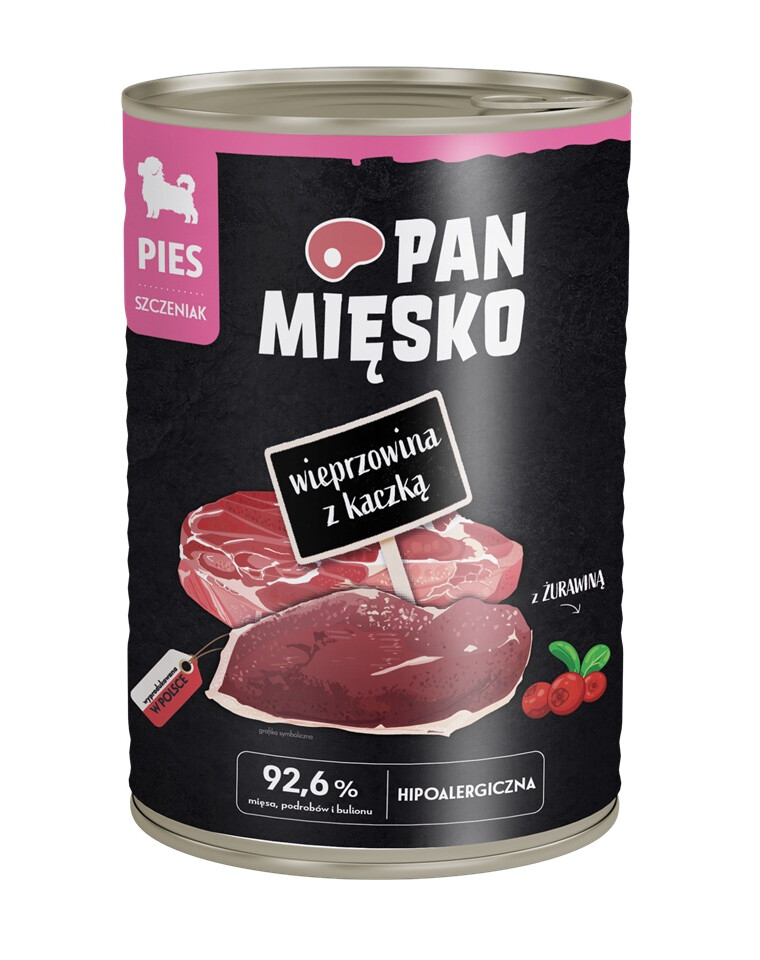 Poznaj wysokomięsne karmy mokre dla psów Pan Mięsko. Wyróżniają je starannie wyselekcjonowane mięsa z dodatkiem soczystych polskich jabłek i cennych dodatków, jak zioła, czy nasiona, które pozytywnie wpłyną na zdrowie oraz kondycję Twojego psa. Nasze receptury zostały przygotowane przez specjalistów, po to, aby dostarczyć Twojemu czworonożnemu towarzyszowi dokładnie to, czego potrzebuje. Twój pies zasługuje na wszystko, co najlepsze.