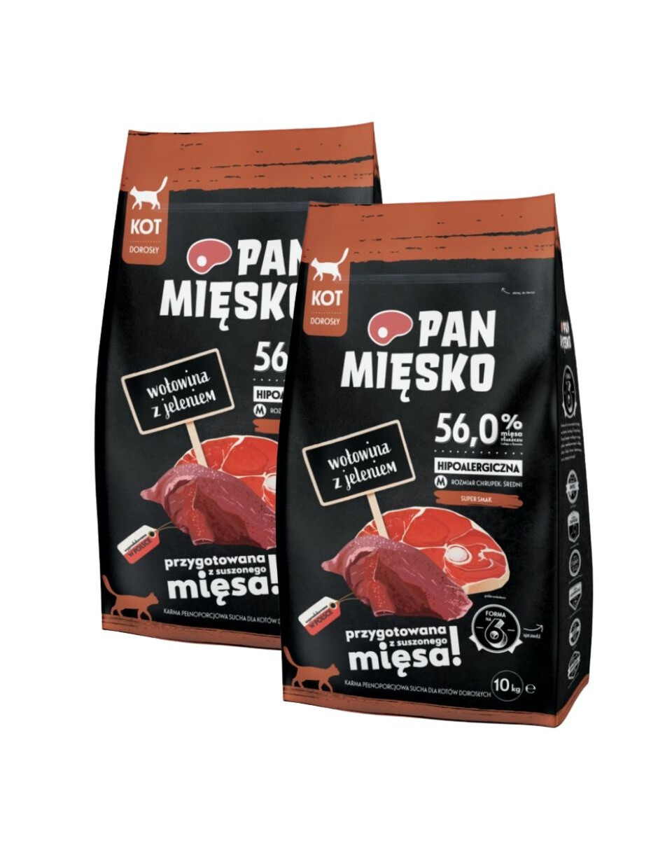 Poznaj hipoalergiczne suche karmy dla kotów Pan Mięsko. Wyróżniają je starannie wyselekcjonowane mięsa z dodatkiem soczystych polskich jabłek, zdrowych warzyw i cennych składników odżywczych, które pozytywnie wpłyną na zdrowie oraz kondycję Twojego kota. Nasze receptury zostały przygotowane przez specjalistów, po to, aby dostarczyć Twojemu czworonożnemu towarzyszowi dokładnie to, czego potrzebuje. Twój kot zasługuje na wszystko, co najlepsze.