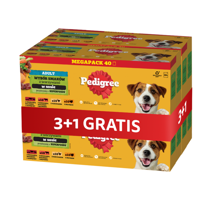PEDIGREE Adult Wybór Smaków z warzywami saszetki 120x100 g mokra karma pełnoporcjowa dla dorosłych psów, z mieszanką wołowiny i jagnięciny, z mieszanką wołowiny i wątróbki, z kurczakiem, z indykiem, w sosie + 40 saszetek GRATIS