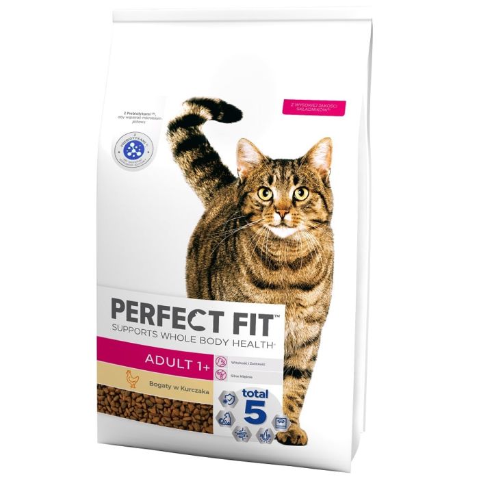 Pyszny pokarm Perfect Fit Adult 1+ bogaty w kurczaka zawiera wyjątkową formułę Total 5, która wspiera 5 najważniejszych obszarów zdrowia dorosłego pupila: wspomaga silny układ odpornościowy, zdrowe trawienie, zdrowy układ moczowy, zdrową skórę i sierść oraz utrzymanie optymalnej kondycji i masy ciała. Receptura Perfect Fit Adult 1+ została opracowana we współpracy z lekarzami weterynarii oraz specjalistami ds. żywienia z Instytutu Nauki o Zwierzętach WALTHAM, aby dostarczyć niezbędne składniki odżywcze dorosłym kotom. Tak jak inne warianty, również pokarm Perfect Fit Adult 1+ bogaty w kurczaka dostarcza dodatkowe korzyści: wspiera witalność i zwinność, silne mięśnie, zdrowe dziąsła i zęby, a także zawiera naturalne prebiotyki, aby dbać o mikrobiom jelitowy. Wybierając to pożywienie dla swojego pupila, masz pewność, że unikalna formuła Perfect Fit wspiera zdrowie całego organizmu Twojego kota oraz zapewnia mu dodatkowe korzyści zdrowotne, które są specjalnie dopasowane do jego wieku i indywidulanych wymagań.
