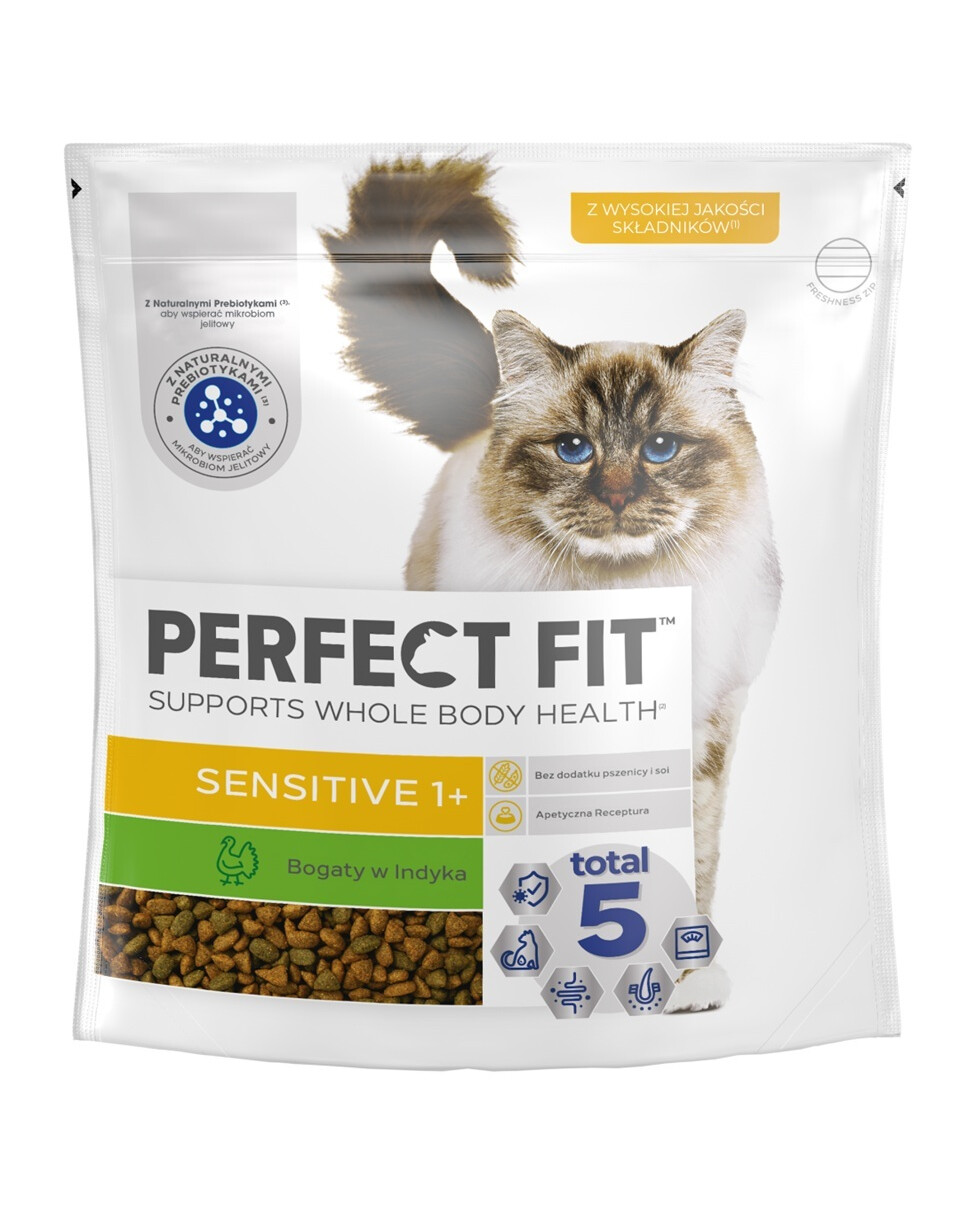 Pyszny pokarm Perfect Fit Sensitive 1+ bogaty w indyka zawiera wyjątkową formułę Total 5, która wspiera 5 najważniejszych obszarów zdrowia dorosłego pupila: wspomaga silny układ odpornościowy, zdrowe trawienie, zdrowy układ moczowy, zdrową skórę i sierść oraz utrzymanie optymalnej kondycji i masy ciała. Receptura Perfect Fit Sensitive 1+ została opracowana we współpracy z lekarzami weterynarii oraz specjalistami ds. żywienia z Instytutu Nauki o Zwierzętach WALTHAM, aby dostarczyć niezbędne składniki odżywcze dorosłym, wrażliwym kotom. Tak jak inne warianty, również pokarm Perfect Fit Sensitive 1+ bogaty w indyka dostarcza dodatkowe korzyści: jest wyprodukowany bez pszenicy i soi, ma apetyczną recepturę, a także zawiera naturalne prebiotyki, aby dbać o mikrobiom jelitowy. Wybierając to pożywienie dla swojego wrażliwego pupila, masz pewność, że unikalna formuła Perfect Fit wspiera zdrowie całego organizmu Twojego kota oraz zapewnia mu dodatkowe korzyści zdrowotne, które są specjalnie dopasowane do jego wieku i indywidulanych wymagań.