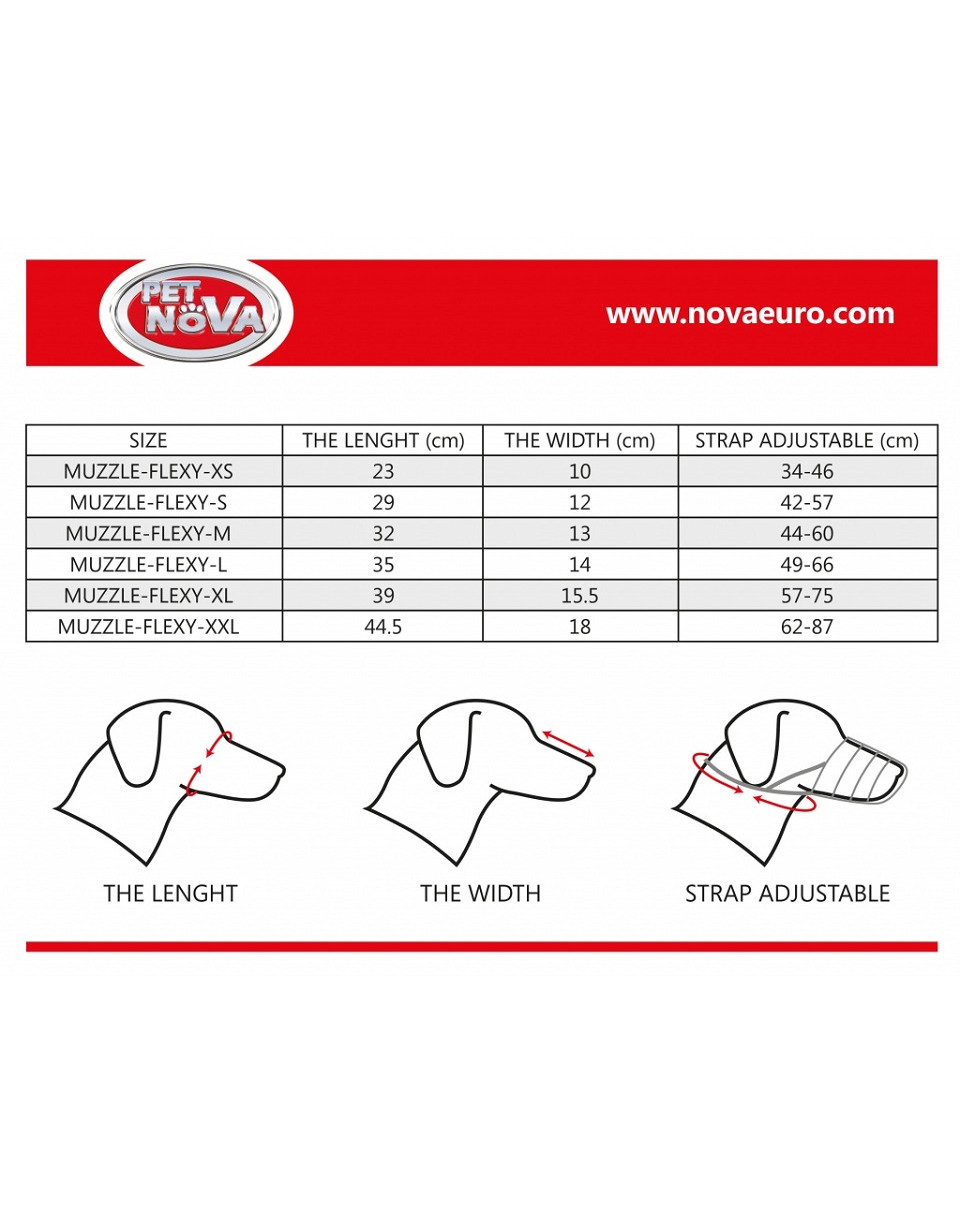 Kaganiec PET NOVA Flexy wykonane są z bardzo wytrzymałego materiału przy jednoczesnym zachowaniu dużej elastyczności produktu. Kaganiec gwarantuje zatem maksymalne bezpieczeństwo i komfort użytkowania, gdyż pies może swobodnie pić i dyszeć. Intuicyjny system regulacji i zapinania kagańca ułatwia codzienne zakładanie i zdejmowanie. Kagańce dostępne w sześciu rozmiarach. Tabela rozmiarów widoczna na zdjęciu. Ważne jest, aby dobrać kaganiec tak, aby między nosem psa a końcem kufy pozostawało około 1 cm odstępu.