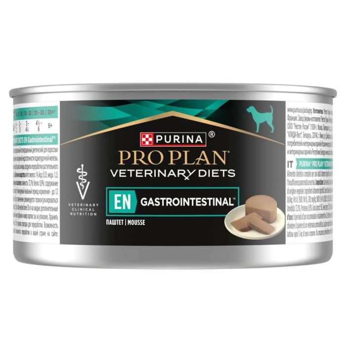 PURINA PRO PLAN Veterinary Diets EN Gastrointestinal Mousse to pełnoporcjowa karma dietetyczna przeznaczona dla dorosłych psów wymagających wsparcia w przypadku zaburzeń trawienia lub zewnątrzwydzielniczej niewydolności trzustki (EPI). Mousse o wyjątkowo delikatnej konsystencji bazuje na składnikach o bardzo wysokiej strawności, co zmniejsza obciążenie osłabionego przewodu pokarmowego i wspiera efektywność procesu trawienia.
