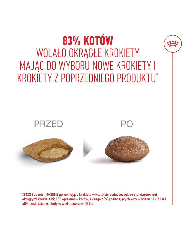 Krokiety w karmie ROYAL CANIN AGEING 15+ zostały opracowane i przetestowane przez koty w podeszłym wieku tak, aby ułatwić im jedzenie i sprawić, aby każdy posiłek był przyjemnością. Receptura charakteryzuje się także wyjątkową smakowitością*.