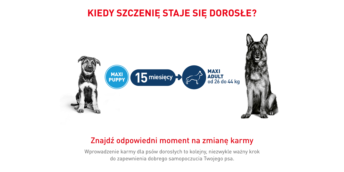 Po ukończeniu 15 miesiąca życia psy ras dużych potrzebują diety, która jest odpowiednio dostosowana do potrzeb pokarmowych dorosłego psa. W tym czasie należy przejść na karmę dla psów dorosłych ras dużych, np. ROYAL CANIN® Maxi Adult, dostępną w formie karmy suchej lub mokrej (kawałki w sosie).
