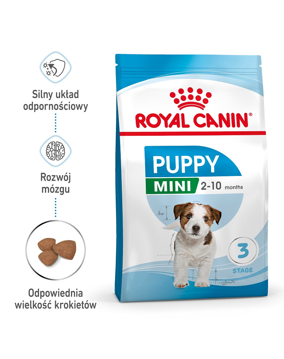 Karma sucha ROYAL CANIN® Mini Puppy została specjalnie opracowana, aby pokrywać w pełni potrzeby pokarmowe szczeniąt ras małych. Karma jest przeznaczona dla szczeniąt w wieku od 2 do 10 miesięcy, których masa ciała po zakończeniu wzrostu nie przekroczy 10 kg.