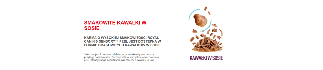 Tekstura karmy ROYAL CANIN® Sensory Feel kawałki w sosie jest kremowa i delikatna, a smakowity sos dobrze przylega do kawałków. Karma została specjalnie opracowana w celu intensywnego pobudzania wrażeń czuciowych u kotów
