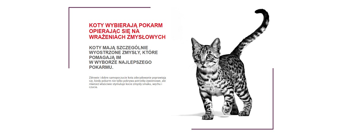 Koty przy wyborze karmy polegają na swoich zmysłach. Zdrowie i samopoczucie kota poprawia się, gdy jego dieta stymuluje zmysł węchu, dotyku i smaku, jednocześnie wspierając jego specyficzne potrzeby żywieniowe.