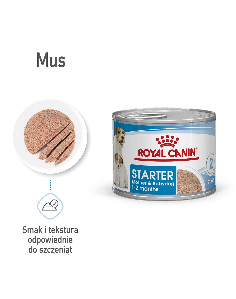 Karma mokra ROYAL CANIN® Starter Mousse Mother & Babydog została specjalnie opracowana, aby pokrywać w pełni potrzeby pokarmowe ciężarnych i karmiących suk oraz szczeniąt w okresie odsadzania, do 2 miesiąca życia.