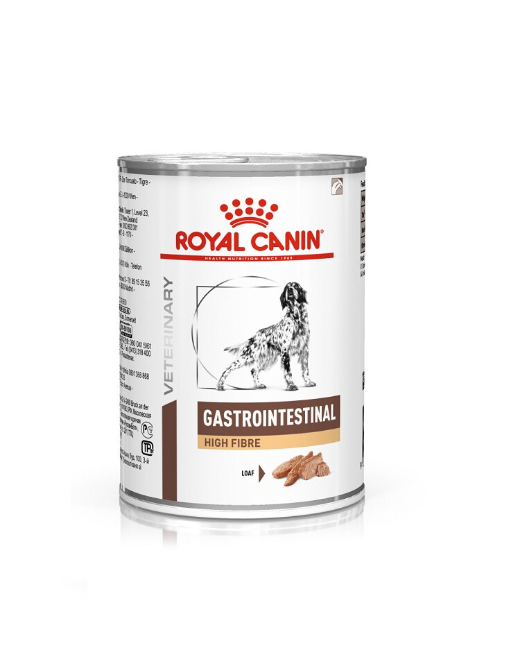 ROYAL CANIN GASTROINTESTINAL HIGH FIBRE pasztet to pełnoporcjowa dietetyczna karma dla psów, opracowana w celu wyrównania zaburzeń trawienia. Karma wysokostrawna.