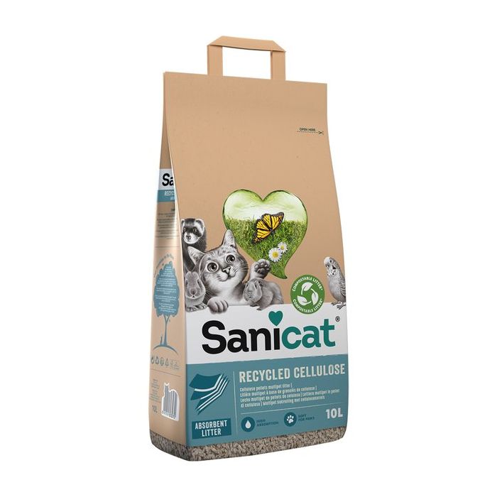 Żwirek SANICAT Cellulose składa się z chłonnych granulek wykonanych z celulozy pochodzącej z recyklingu i nadaje się do kompostowania.
