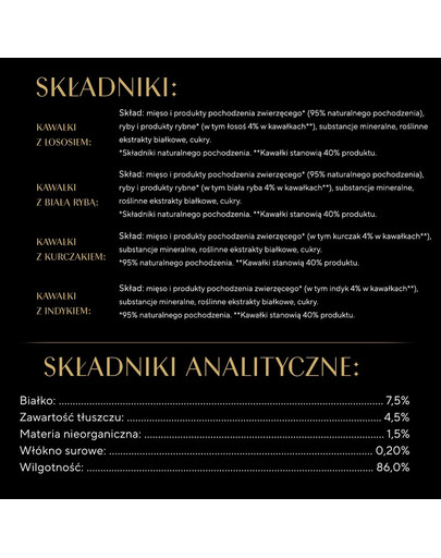 Kawałki z białą rybą. Skład: mięso i produkty pochodzenia zwierzęcego* (95% naturalnego pochodzenia), ryby i produkty rybne* (w tym biała ryba 4% w kawałkach**), substancje mineralne, roślinne ekstrakty białkowe, cukry. *Składniki naturalnego pochodzenia. **Kawałki stanowią 40% produktu.