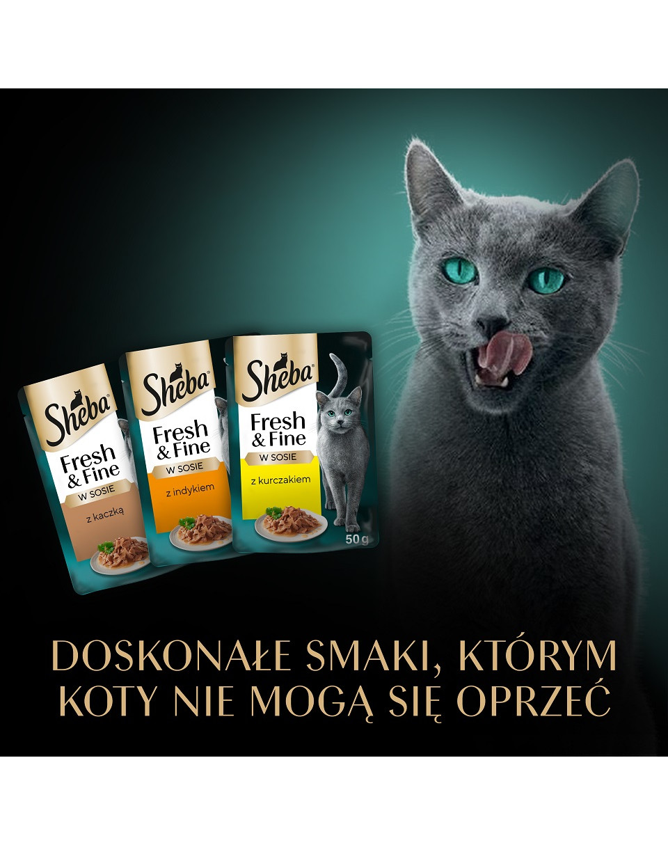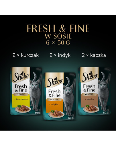 SHEBA Fresh & Fine to wyśmienity, pełnoporcjowy pokarm dla dorosłych kotów. Pozwól swojemu kotu rozsmakować się w trzech wyjątkowych smakach: z kurczakiem, z indykiem i z kaczką. Zobacz jak Twój koci przyjaciel ucieszy się, gdy podasz mu delikatne kawałki zanurzone w jedwabistym sosie. Receptura zawiera wyłącznie składniki najwyższej jakości. Dzięki temu możesz mieć pewność, że Twój kot otrzymuje wykwintne jedzenie, które dostarczy mu wszystkich niezbędnych składników odżywczych oraz odpowiednią ilość witamin i minerałów.