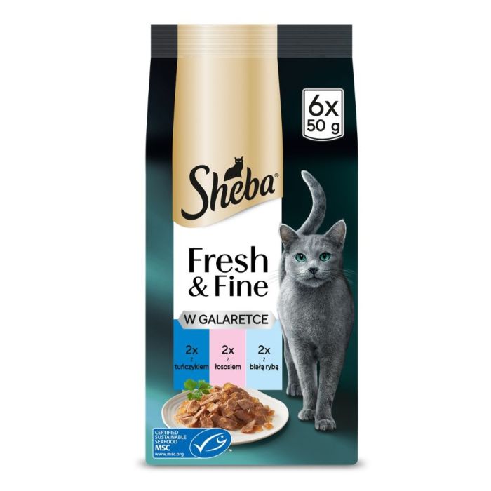 SHEBA Fresh & Fine w galaretce 6x50g z tuńczykiem, łososiem i białą rybą, mokra karma dla kotów